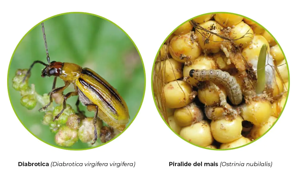 La Diabrotica (Diabrotica virgifera virgifera) è un coleottero originario degli Stati Uniti, comparso per la prima volta in Italia nel 1998. Il danno maggiore è provocato dalle larve, che si nutrono delle radichette e scavano gallerie nelle radici più grosse; le piante danneggiate presentano un ridotto sviluppo radicale, il quale le rende più soggette ad allettamenti, ne riduce la capacità di assorbimento di acqua e nutritivi e, durante le operazioni di raccolta, provoca maggiori perdite di produzione.